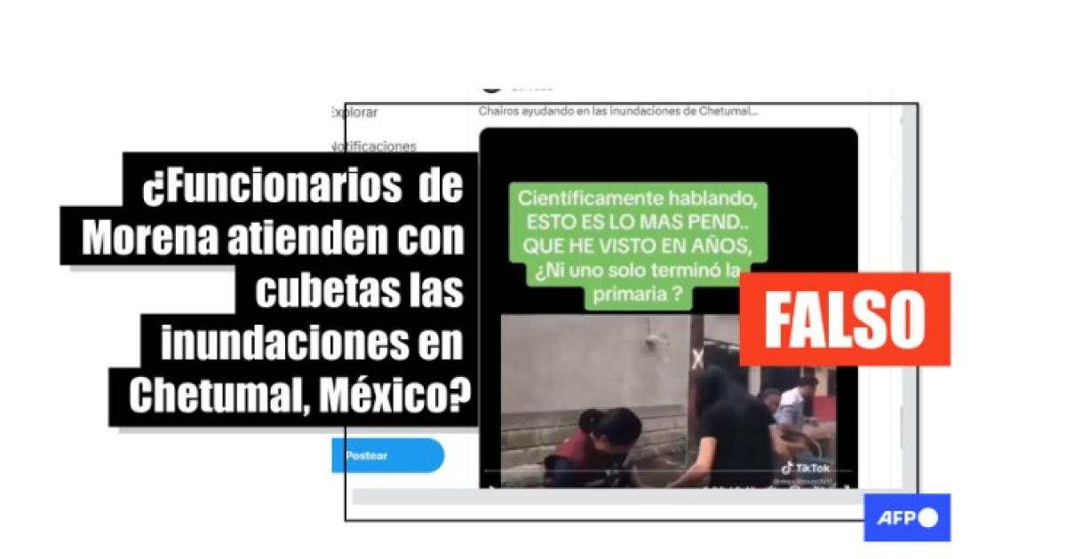 “Chairos ayudando en las inundaciones de Chetumal…”, dicen usuarios de X y Facebook (1, 2) que comparten un video en el que se ve a un grupo de personas pasándose cubetas de agua sobre una calle inundada. Algunas usan chalecos color guinda, asociado al partido oficialista Morena y utilizado por el gobierno federal, así como por otras autoridades en el país en Ciudad de México y diversos ayuntamientos. El adjetivo “chairos” en México se usa en ocasiones para describir a los militantes de Morena en forma despectiva.