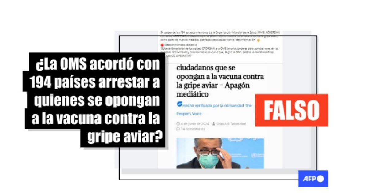 “194 países de la OMS acuerdan arrestar a ciudadanos que se opongan a la vacuna contra la gripe aviar”, advierten publicaciones que circulan en Facebook, Telegram y X (1, 2).