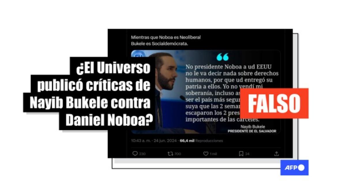 Titular del diario El Universo de Ecuador con cita de Bukele sobre Noboa es falso