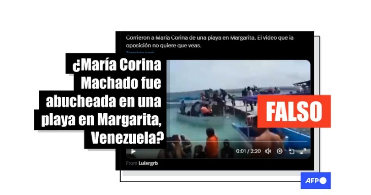 “Corrieron a María Corina de una playa en Margarita. El video que la oposición no quiere que veas”, señalan publicaciones compartidas en Facebook (1, 2) y X.