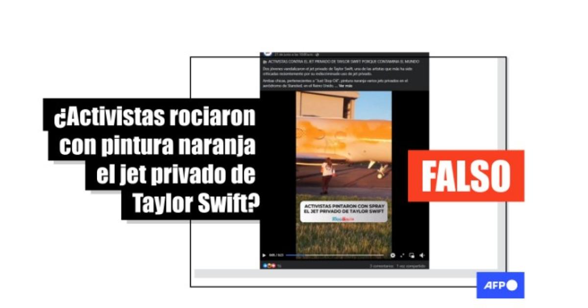 “ACTIVISTAS CONTRA EL JET PRIVADO DE TAYLOR SWIFT PORQUE CONTAMINA EL MUNDO. Dos jóvenes vandalizaron el jet privado de Taylor Swift, una de las artistas que más ha sido criticadas recientemente por su indiscriminado uso de jet privado. Ambas chicas, pertenecientes a ‘Just Stop Oil’, pintaron naranja varios jets privados en el aeródromo de Stansted, en el Reino Unido”, dice una de las publicaciones compartidas en Facebook (1, 2) y TikTok.