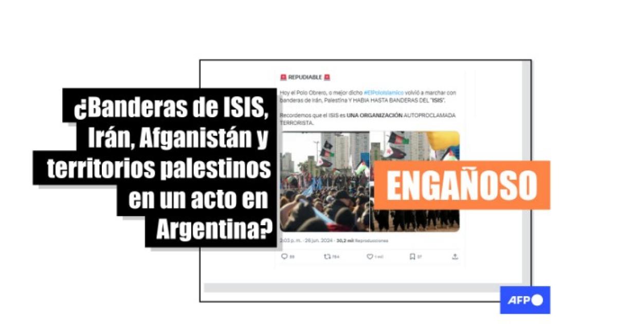 “Hoy el Polo Obrero, o mejor dicho #ElPoloIslamico volvió a marchar con banderas de Irán, Palestina Y HABIA HASTA BANDERAS DEL ‘ISIS’”, publica un usuario en X, junto a la fotografía de una manifestación. El contenido también circuló en Facebook e Instagram.