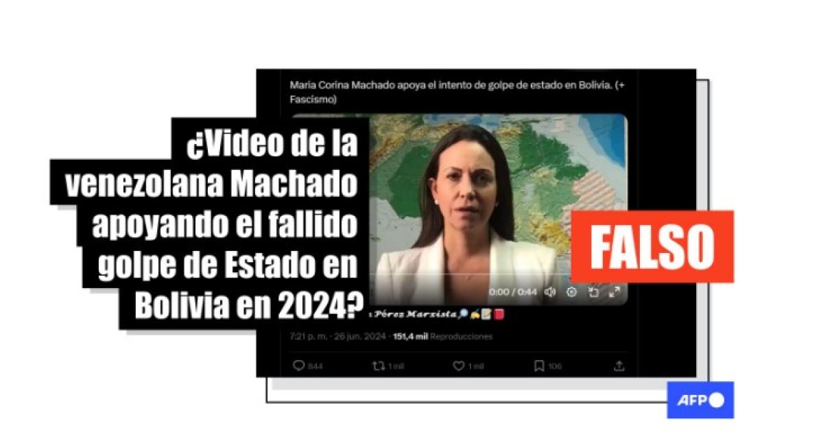 “Maria Corina Machado apoya el intento de golpe de estado en Bolivia” y “Acá la tienen a la oligarca venezolana Corina Machado, apoyando el intento de golpe en Bolivia. Está ‘persona’ dice que en Venezuela hay una dictadura hace 25 años y nunca le pasó nada, a pesar de que pidió públicamente en muchas ocasiones que EEUU invada”, señalan publicaciones en X, Facebook (1, 2) y TikTok.