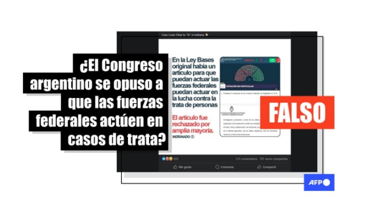 “En la Ley Bases original había un artículo para que puedan actuar las fuerzas federales en la lucha contra la trata de personas. El artículo fue rechazado por amplia mayoría”, reza un mensaje publicado por la cuenta “Indignado” en Facebook. La publicación incluye el comentario “Caso Loan: Deja tu ‘Si’ si indigna” y una captura del panel de votación de la Cámara de Diputados argentina, junto a un fragmento de la llamada “ley Bases”.