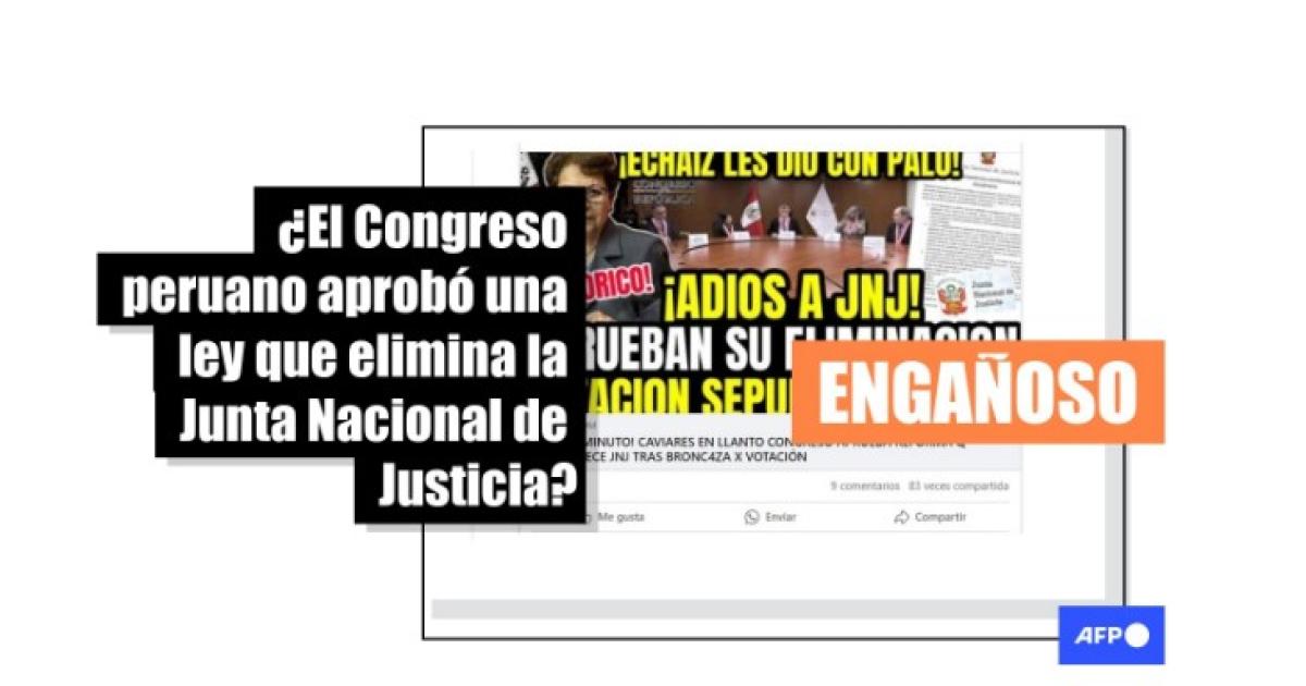 "¡Adiós a JNJ! Aprueban su eliminación", se lee en publicaciones compartidas en Facebook (1, 2) y YouTube, que dirigen a un video de 21 minutos de duración con el título “Congreso aprueba reforma que desaparece JNJ”. En el comienzo, una voz en off señala: “En sesión extraordinaria, el Congreso aprobó por mayoría el dictamen que desaparece a la Junta Nacional de Justicia”.