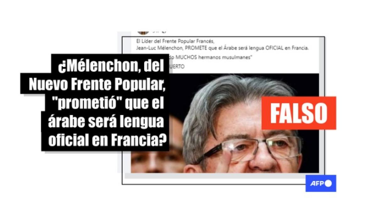 “El pleno festejo Jean-Luc Mélenchon promete que el árabe será lengua oficial en su país, porque ‘le votaron muchos musulmanes’”, se lee en publicaciones en Facebook y X.
