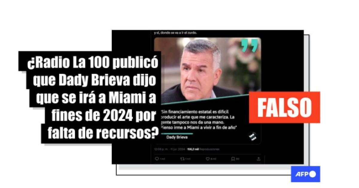 Búsquedas en Google con los términos “Dady Brieva”, “financiamiento estatal” y “Miami” no arrojaron resultados relacionados con las supuestas declaraciones del actor. La placa viral tampoco se encuentra en las redes oficiales de radio La 100 (1, 2, 3).