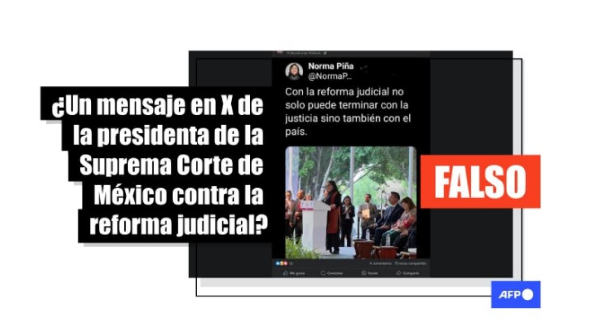 “Con la reforma judicial no solo puede terminar con la justicia sino también con el país”, señala el mensaje en X supuestamente escrito por Piña. Usuarios comparten una captura de pantalla de esa entrada en Facebook (1, 2) y X.