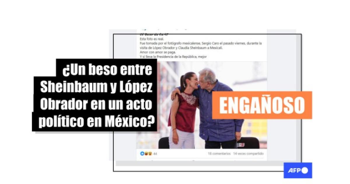 “El beso de la 4T. Esta foto es real. Fue tomada por el fotógrafo mexicalense, Sergio Caro el pasado viernes, durante la visita de López Obrador y Claudia Sheinbaum a Mexicali. Amor con amor se paga. Y si lleva la Presidencia de la República, mejor”, dicen las publicaciones en Facebook (1, 2) y X.