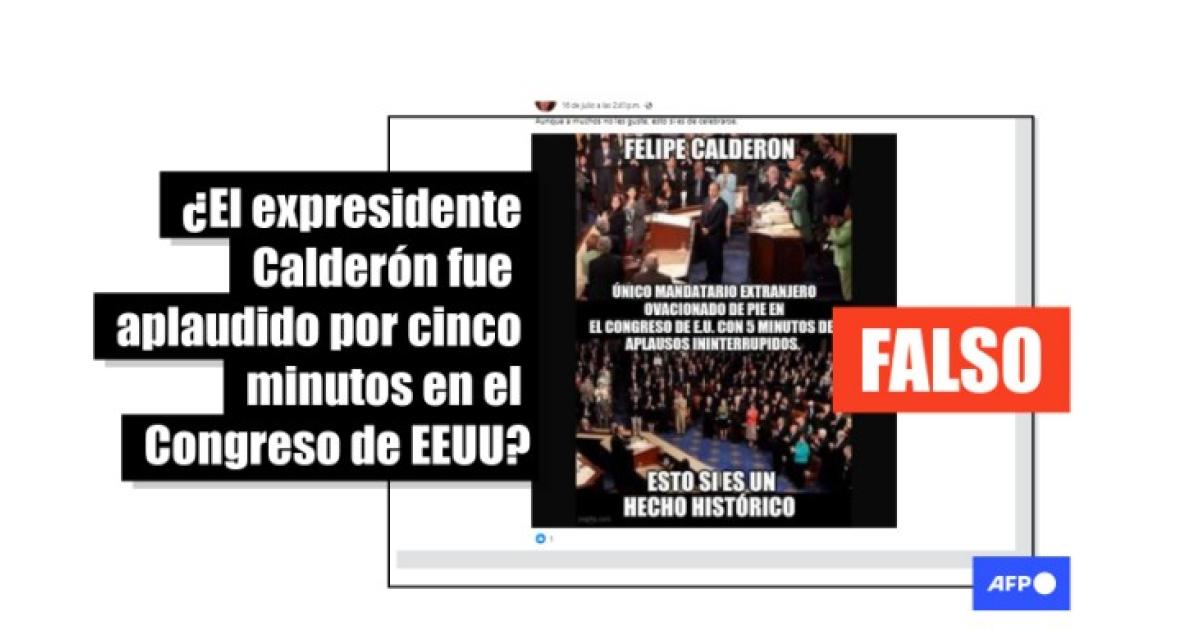 “FELIPE CALDERÓN ÚNICO MANDATARIO EXTRANJERO OVACIONADO DE PIE EN EL CONGRESO DE E.U. CON 5 MINUTOS DE APLAUSOS ININTERRUMPIDOS. ESTO SI ES UN HECHO HISTÓRICO”, señala la imagen difundida en Facebook (1, 2).
