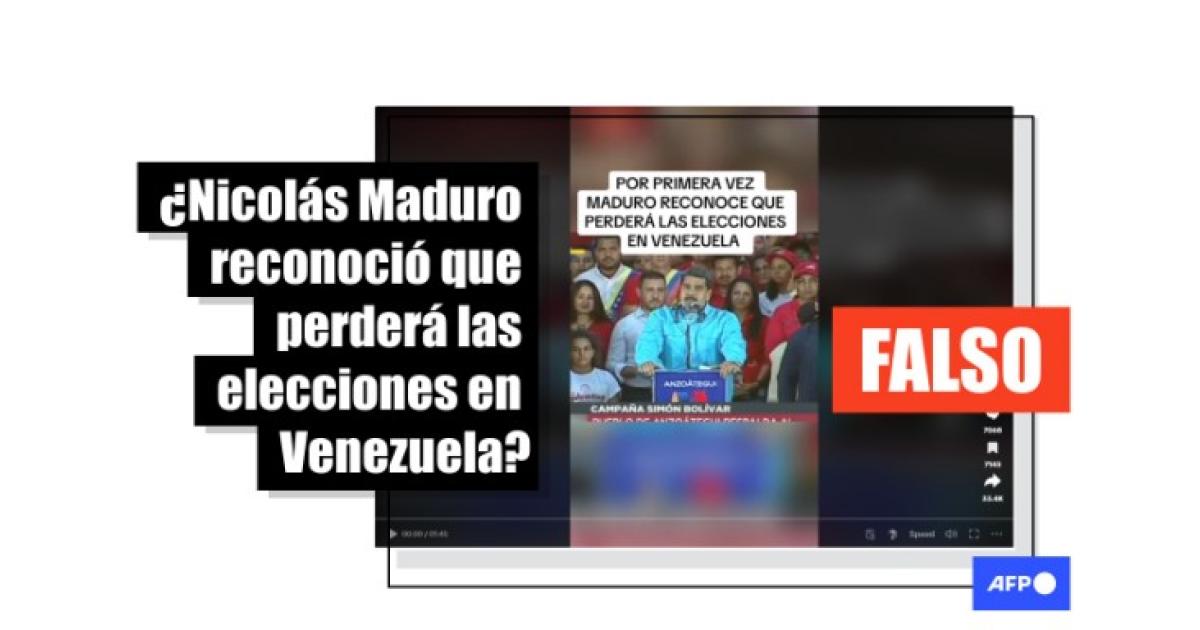 “Por primera vez Maduro reconoce que perderá las elecciones en Venezuela”, dice un texto sobrepuesto en una secuencia compartida en TikTok, X y Facebook (1, 2).