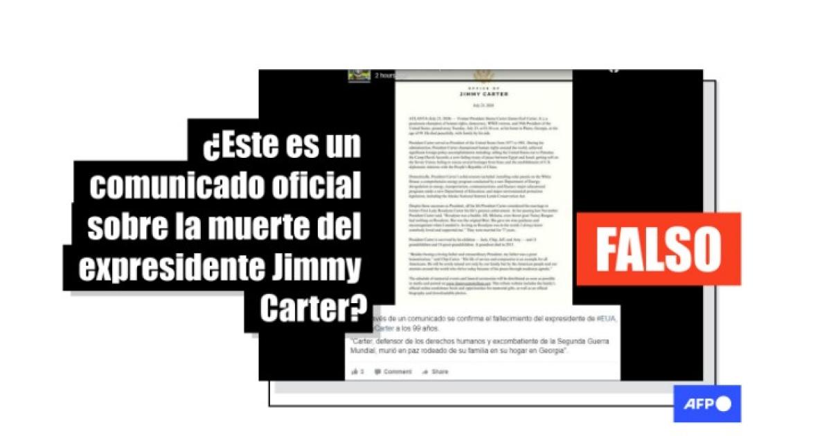 “A través de un comunicado se confirma el fallecimiento del expresidente de EUA, Jimmy Carter a los 99 años”, afirma una de las publicaciones en Facebook (1, 2), Threads y X (1, 2).