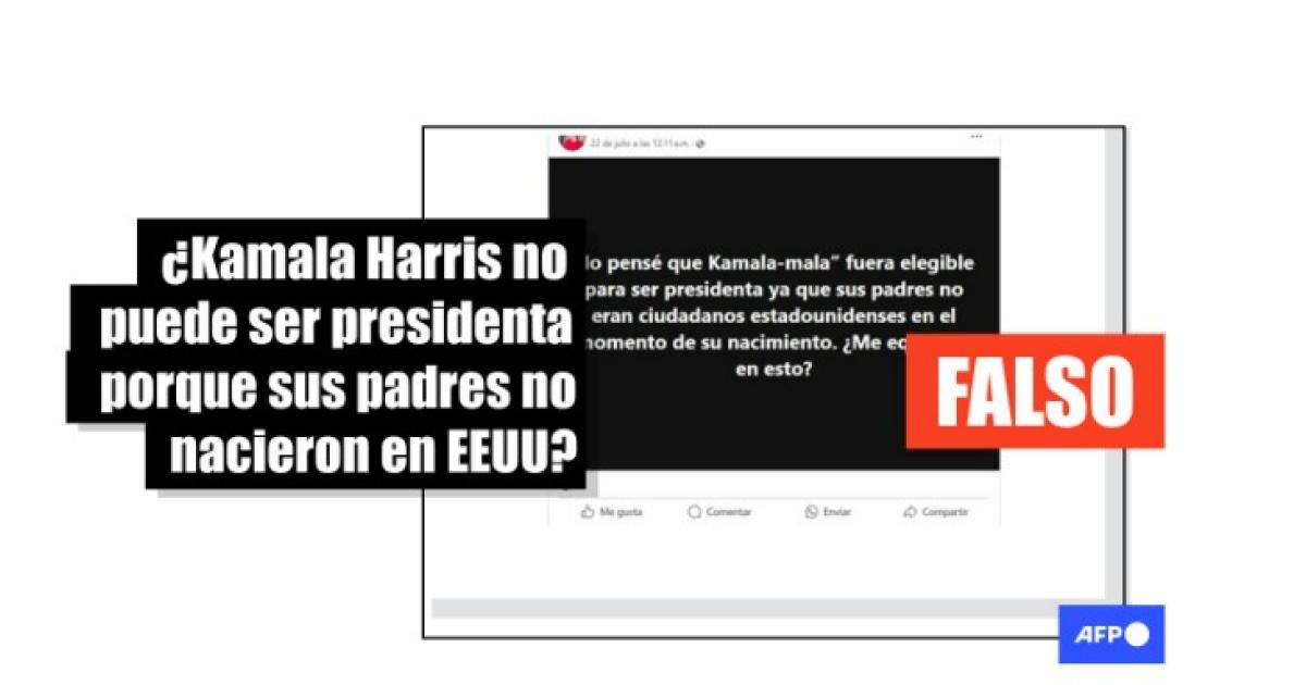 “KAMALA NO PUEDE SER PRESIDENTA DE LOS ESTADOS UNIDOS DE AMÉRICA, SUS PADRES ERAN ESTUDIANTES EXTRANJEROS AL MOMENTO DE SU NACIMIENTO. LA CONSTITUCION DICE QUE TIENE SER NACIDO EN LOS ESTADOS UNIDOS DE AMÉRICA”, dicen publicaciones en Facebook (1, 2) y X (1, 2).