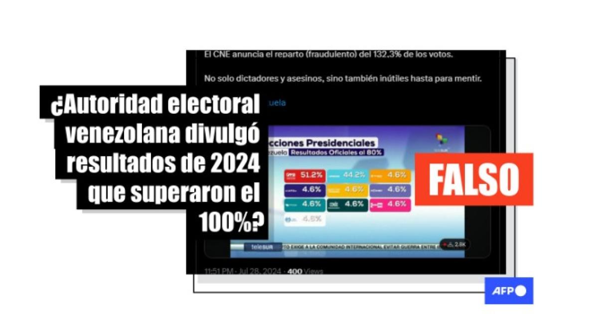 “El robo fue DESCARADO. El porcentaje de votos publicados por el CNE, suma 132,3% y curiosamente, ocho candidatos, sacaron la misma cantidad de votos: 4,6%”, recogen los mensajes compartidos en X (1, 2) y Facebook (1, 2), e ilustrados con una gráfica titulada: “Elecciones Presidenciales. Venezuela. Resultados oficiales al 80%”.