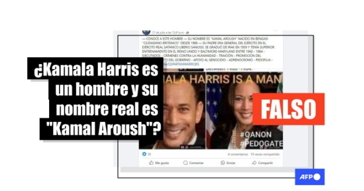 “CONOCE A ESTE HOMBRE — SU NOMBRE ES ‘KAMAL AROUSH’ NACIDO EN BENGASI ‘CIUDADANO BRITÁNICO'’ DESDE 1986 — SU PADRE ERA GENERAL DEL EJÉRCITO EN EL EJÉRCITO REAL SATÁNICO LIBERIO SANUSSI”, dicen publicaciones en Facebook (1, 2) y X (1, 2). Sobre las dos fotos se lee, en inglés, “Kamala Harris es un hombre”.