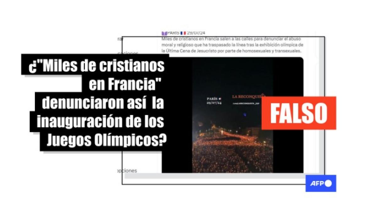 “PARÍS 29/07/24 Miles de cristianos en Francia salen a las calles para denunciar el abuso moral y religioso que ha traspasado la línea tras la exhibición olímpica de la Última Cena de Jesucristo por parte de homosexuales y transexuales”, se lee en una publicación en X junto con un video que muestra una congregación nocturna de personas portando velas.
