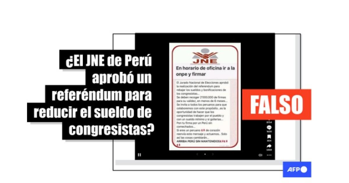 “JNE aprobó la realización del referendum para rebajar los sueldos y bonificaciones de los congresistas. Se debe de recoger más de 2 millones de firmas para su validez en menos de 6 meses. En horario de oficina ir a la ONPE”, se lee en publicaciones compartidas en Facebook (1, 2) y TikTok.