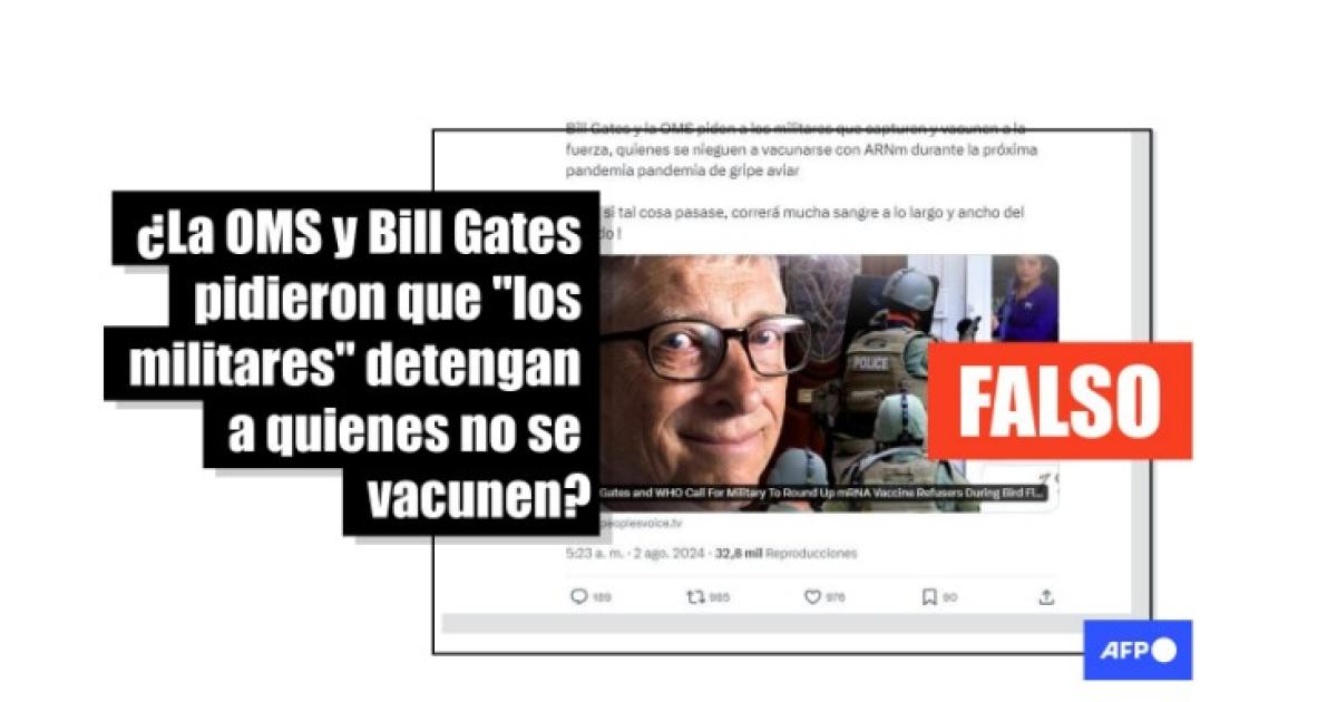 “Bill Gates y la OMS piden a los militares que capturen y vacunen a la fuerza, quienes se nieguen a vacunarse con ARNm durante la próxima pandemia pandemia de gripe aviar”, alerta una publicación en X. Afirmaciones similares circulan en Facebook, Telegram, Instagram y en publicaciones en inglés y francés.