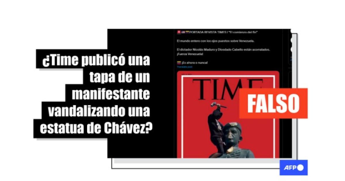 “PORTADA REVISTA TIMES”, anuncian publicaciones compartidas en X y Facebook que incluyen una supuesta tapa de la revista estadounidense Time, con un manifestante destruyendo una estatua de Hugo Chávez sobre un fondo rojo y la leyenda “El comienzo del fin”.