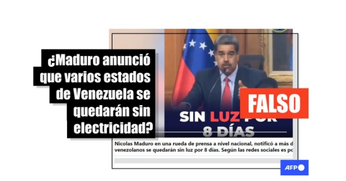 “Nicolas Maduro en una rueda de prensa a nivel nacional, notificó a más de 10 estados venezolanos se quedarán sin luz por 8 días. Según las redes sociales es por elegir a Edmundo Gonzáles y María Corina Machado”, dicen publicaciones compartidas en Facebook (1, 2). Entradas similares circulan en TikTok (1, 2).