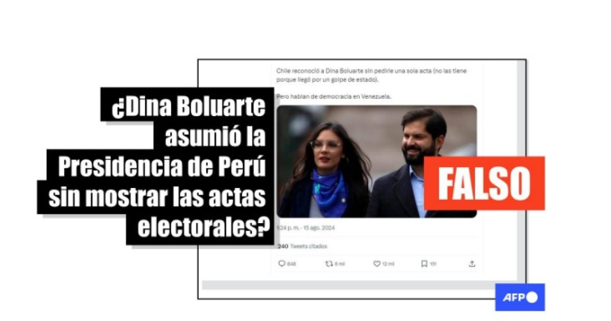 “Chile reconoció a Dina Boluarte sin pedirle una sola acta (no las tiene porque llegó por un golpe de estado). Pero hablan de la democracia en Venezuela”, se lee en publicaciones en Facebook y X, que comparten una foto del presidente de Chile, Gabriel Boric, junto a su ministra secretaria general de Gobierno, Camila Vallejo.