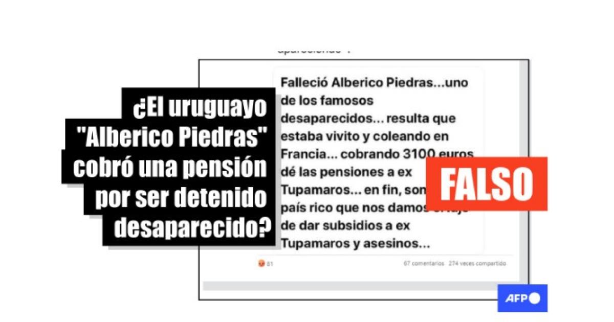 “Falleció Alberico Piedras...uno de los famosos desaparecidos...resulta que estaba vivito y coleando en Francia... cobrando 3100 euros dé las pensiones a ex Tupamaros... en fin, somos un país rico que nos damos el lujo de dar subsidios a ex Tupamaros y asesinos...”, se lee en publicaciones que circulan en Facebook (1, 2).