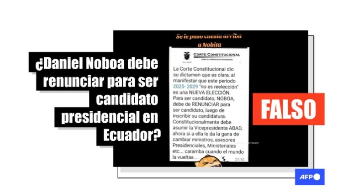 En Facebook y TikTok circula la captura de pantalla de un texto con el identificativo de la Corte Constitucional de Ecuador en la parte superior. En él se indica que la institución “dio su dictamen que es clara [sic], al manifestar que este período 2025 - 2029 ‘no es reelección’, es una nueva elección”. Luego se detalla que Noboa debe renunciar para poder inscribir su candidatura.