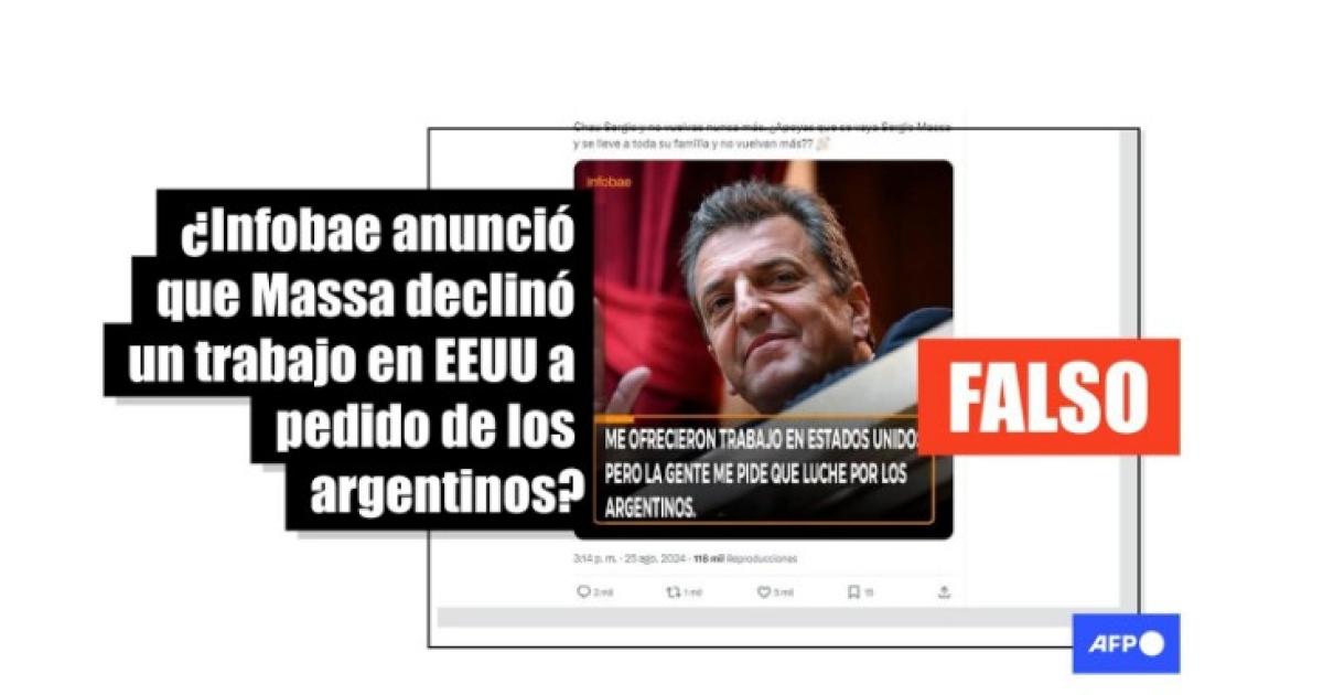 “Me ofrecieron trabajo en Estados Unidos pero la gente me pide que luche por los argentinos”, habría dicho el exministro de Economía argentino, Sergio Massa, en una placa del medio Infobae que circula en X y Facebook.