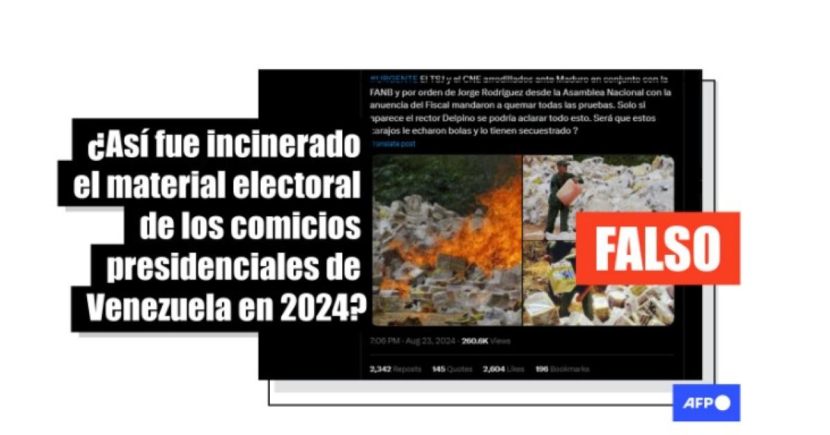 Los mensajes difunden tres fotos que muestran varias decenas de cajas amontonadas con el logo del Consejo Nacional Electoral (CNE) de Venezuela. En una de ellas se aprecia el material mientras se incinera, en otra aparece un uniformado vertiendo un líquido sobre las cajas y en la última se ve a varios militares cerca de las cajas.