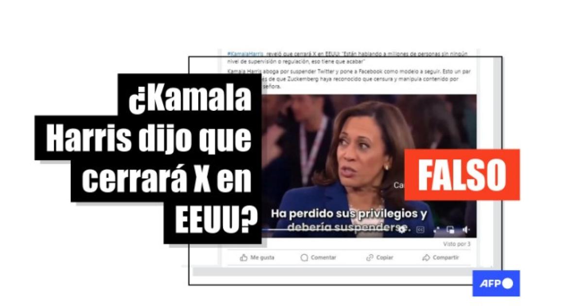 “Kamala Harris reveló que cerrará X en EEUU” señalan entradas en Facebook, Instagram, Telegram y X que incluyen un video en el que se oye decir a la actual candidata a presidenta: “Están hablando a millones de personas sin ningún nivel de supervisión o regulación, eso tiene que acabar”.