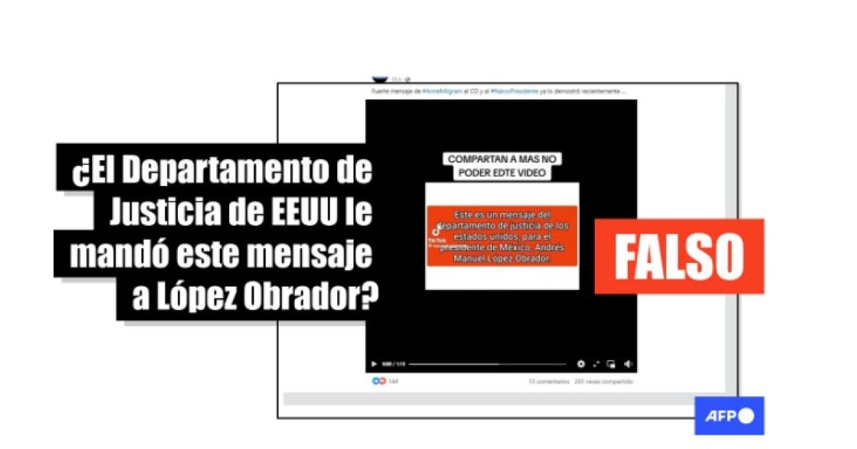 “Este es un mensaje del departamento de justicia de los estados unidos, para el presidente de México, Andrés Manuel López Obrador” y “COMPARTAN A MAS NO PODER EDTE VIDEO”, señalan dos mensajes en un video difundido en Facebook (1, 2).