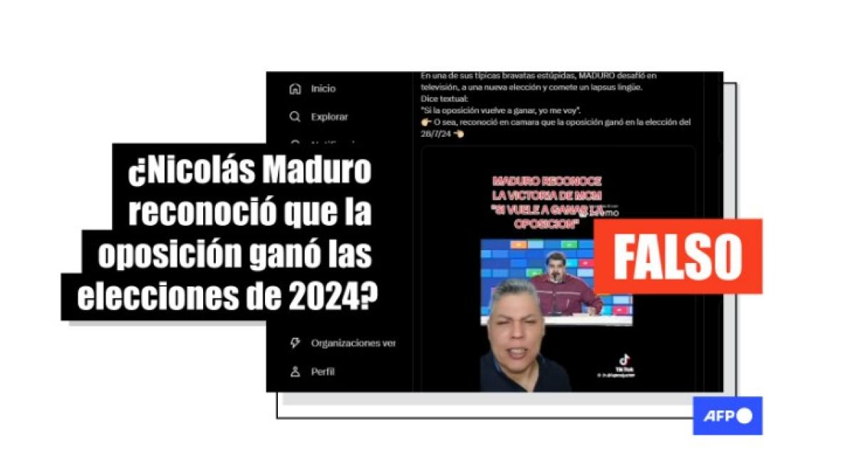 “En una de sus típicas bravatas estúpidas, MADURO desafíó en televisión, a una nueva elección y comete un lapsus lingüe. Dice textual: ´Si la oposición vuelve a ganar, yo me voy´. O sea, reconoció en camara que la oposición ganó en la elección del 28/7/24”, se lee en una publicación compartida en X. Entradas similares circulan en Facebook y TikTok.