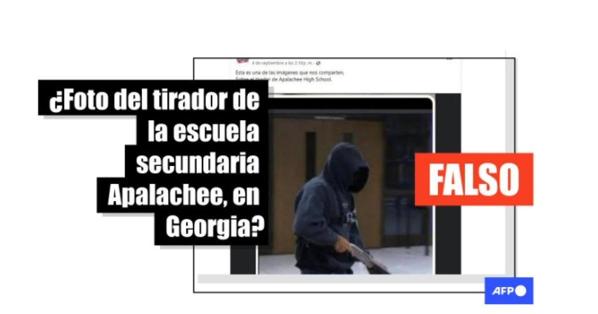 "Esta es una de las imágenes que nos comparten, sobre el tirador de Apalachee High School" se lee en una publicación en Facebook que incluye la fotografía de un hombre encapuchado que porta un arma de asalto. La misma imagen circula también en X y en entradas en inglés.