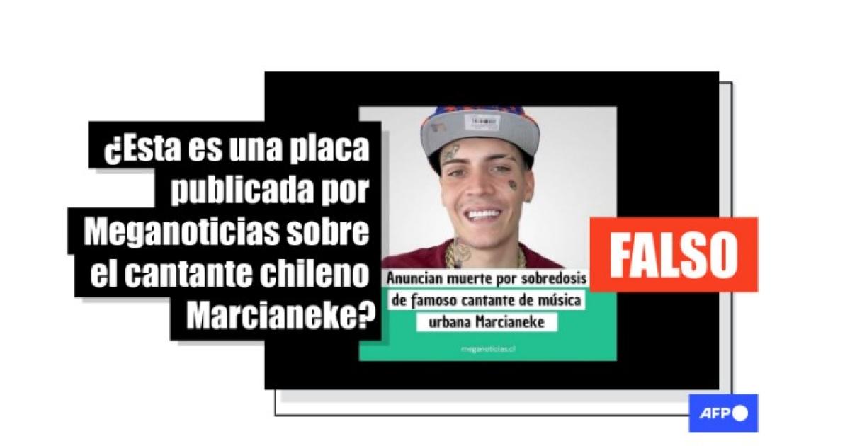 Una supuesta gráfica del medio chileno Meganoticias, en la que se informa de la “muerte por sobredosis” del cantante Marcianeke, es falsa. La pieza ha sido compartida más de 10.000 veces en redes sociales desde el 22 de agosto de 2024. Sin embargo, la imagen fue publicada por una cuenta en TikTok que imita las placas de Meganoticias y el medio desmintió a la AFP haber sido su autor.