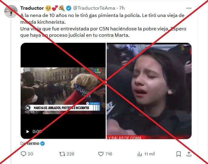 “A la nena de 10 años no le tiró gas pimienta la policía. Le tiró una vieja de mierda kirchnerista”, escribió un usuario en una publicación en X, en la que incluyó un video en el que se ve a una mujer arrojando un polvo naranja a efectivos policiales en las inmediaciones del Congreso argentino, junto a la fotografía de una niña llorando.