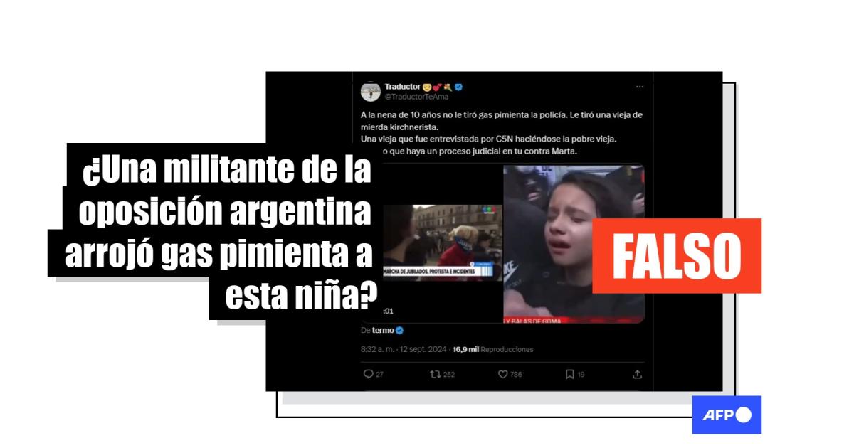 El 11 de septiembre de 2024, una multitud protestó en las inmediaciones del Congreso argentino contra el veto del presidente Javier Milei al aumento de los haberes jubilatorios. En ese contexto, más de 8.000 usuarios de redes sociales compartieron imágenes de una niña herida con gas pimienta con la afirmación de que la responsable era una militante opositora y no las fuerzas de seguridad. Sin embargo, contenido generado por usuarios, emisiones televisivas y material recogido por periodistas de la AFP sobre el terreno demuestran que el gas que afectó a la menor fue arrojado por la policía.