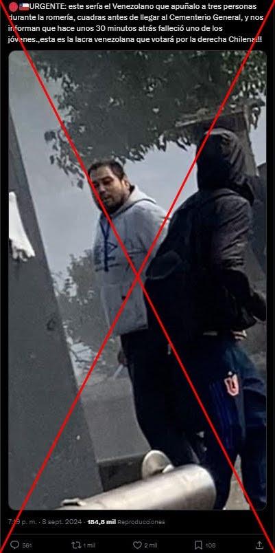 El 8 de septiembre de 2024, durante la romería al Cementerio General de Santiago en memoria de los detenidos desaparecidos y los ejecutados políticos de la dictadura en Chile, un joven fue apuñalado y falleció horas después. Publicaciones compartidas más de 2.000 veces en redes sociales desde entonces muestran la foto del sospechoso del asesinato y aseguran que se trata de un ciudadano venezolano. Pero es falso. La Fiscalía confirmó que el delito fue cometido por un ciudadano chileno, información también comprobada por AFP Factual.