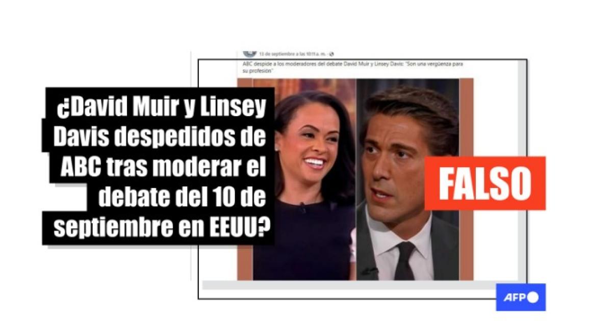 “ABC elimina a los moderadores del debate David Muir y Linsey Davis, calificándolos de ‘una desgracia para su profesión’”, dicen publicaciones en Facebook.