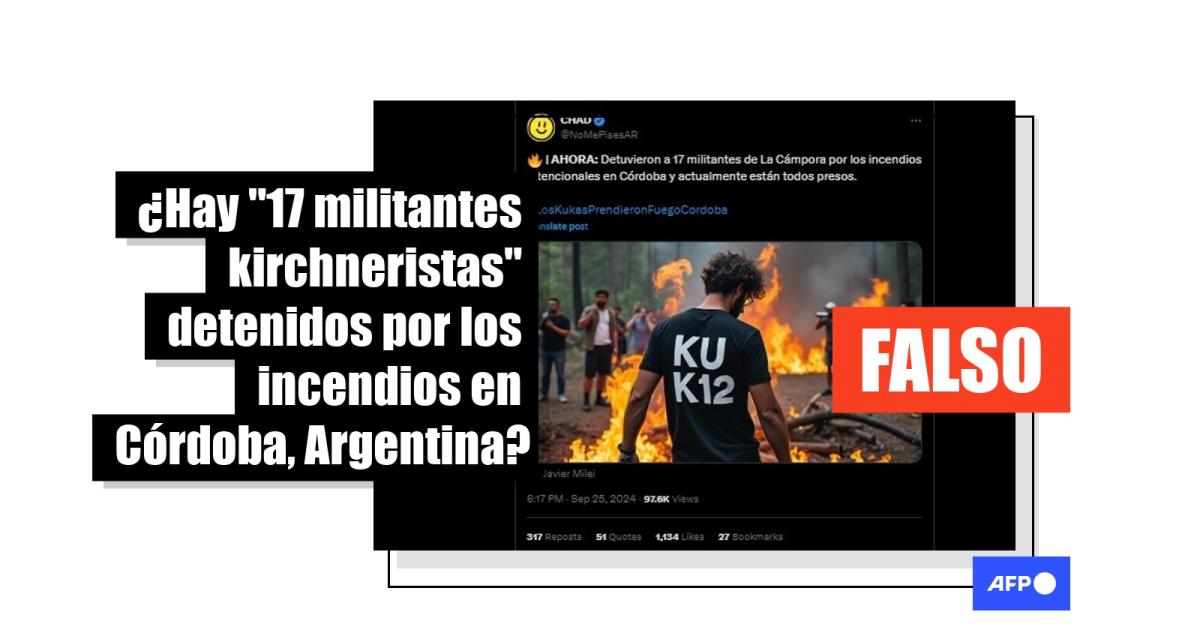 Desde el 2 de septiembre de 2024 un gran incendio forestal azota a la provincia argentina de Córdoba. En ese marco, más de 33.000 usuarios de redes sociales afirman que fueron detenidos 17 militantes de la expresidenta Cristina Fernández de Kirchner, acusados de iniciar el fuego intencionalmente. Sin embargo, el Ministerio Público Fiscal de Córdoba y el Ministro de Seguridad provincial declararon que, al 26 de septiembre, el número de detenidos es menor y no hay indicios de que tuvieran filiaciones o conexiones políticas.