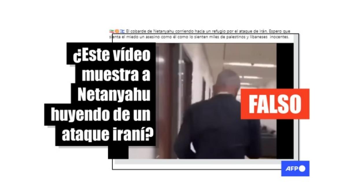 Una publicación en X que también comparte el vídeo asegura que muestra cómo “el primer ministro israelí se escapa hacia un refugio subterráneo tras el inicio del ataque de represalia de Irán”.