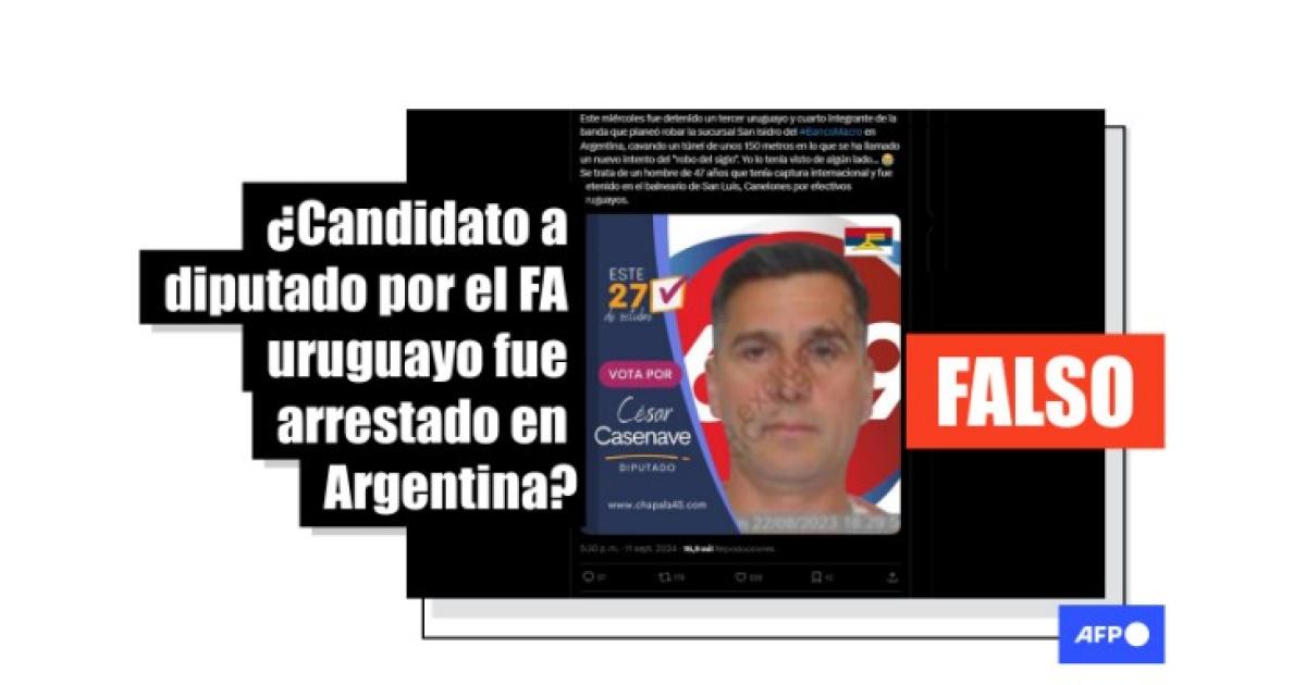 “Revelaron la identidad del tercer uruguayo detenido por el intento de robo al banco de San Isidro” alerta un usuario en Facebook. “(...) Se llama César Leonardo Cazenave Peña, tiene 47 años y cuenta con seis antecedentes penales. ES CANDIDATO A DIPUTACIÓN POR EL FAPIT!!!!!”. La publicación comparte un afiche que llama a votar por el supuesto candidato a diputado. “FAPIT” es una forma despectiva de llamar al Frente Amplio.