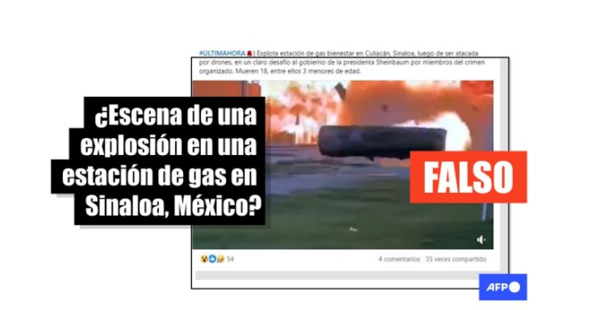 “Explota estación de gas bienestar en Culiacán, Sinaloa, luego de ser atacada por drones, en un claro desafío al gobierno de la presidenta Sheinbaum por miembros del crimen organizado. Mueren 18, entre ellos 3 menores de edad”, dicen las publicaciones junto con la secuencia de seis segundos en Facebook y X (1, 2).