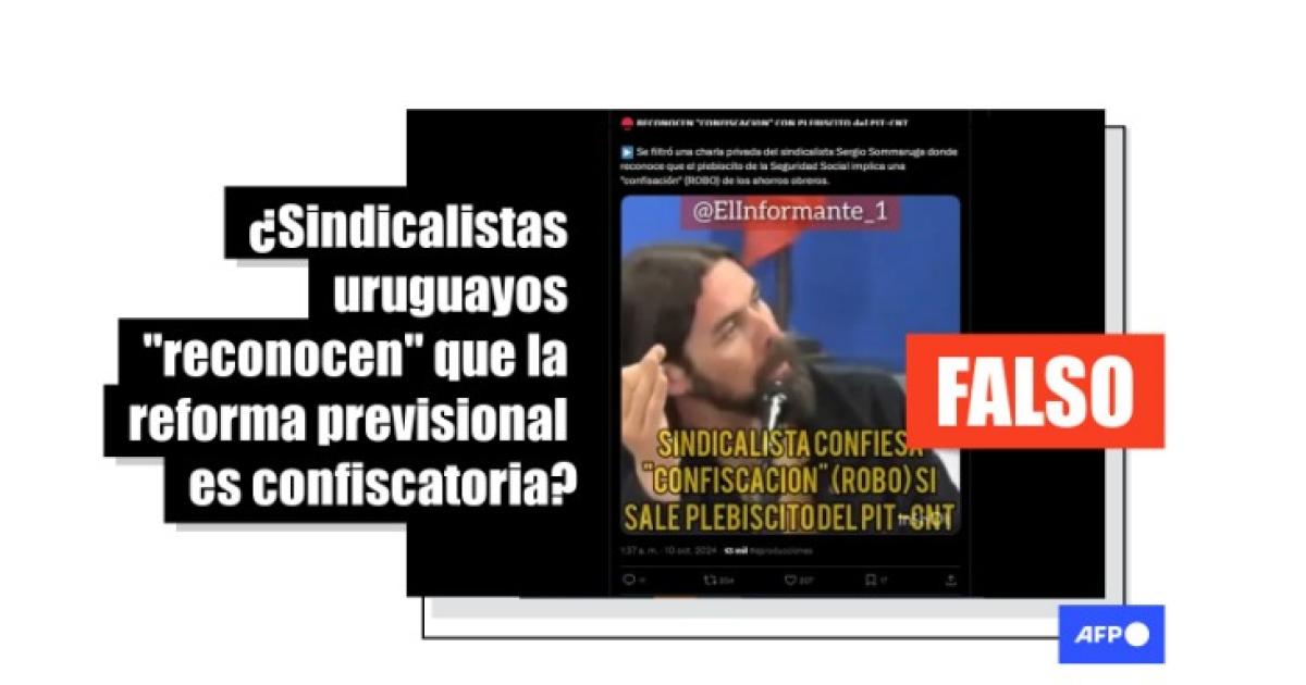 “Se filtró una charla privada del sindicalista Sergio Sommaruga donde reconoce que el plebiscito de la Seguridad Social implica una ‘confisación’ (ROBO) de los ahorros obreros”, publican usuarios en X y Facebook junto a un video del gremialista, miembro de la central sindical PIT-CNT.