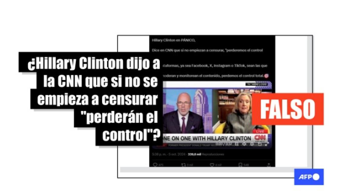 “Hillary Clinton en PÁNICO. Dice en CNN que si no empiezan a censurar, ‘perderemos el control total’” escribe un usuario en X junto al fragmento de una entrevista televisiva a la exsecretaria de Estado estadounidense.