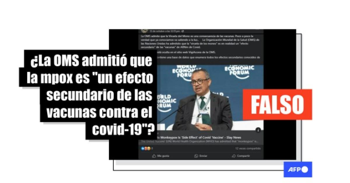 “La Organización Mundial de la Salud (OMS) de las Naciones Unidas (ONU) ha admitido que la ‘viruela del mono’ es en realidad un ‘efecto secundario’ de las ‘vacunas’ de ARNm contra el Covid”, se lee en publicaciones en Facebook y X que aseguran que el organismo sanitario publicó esa información en el sitio web VigiAccess.