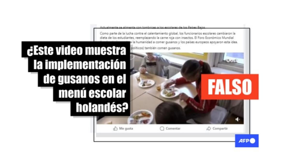 “Actualmente se alimenta con lombrices a los escolares de los Países Bajos. Como parte de la lucha contra el calentamiento global, los funcionarios escolares cambiaron la dieta de los estudiantes, reemplazando la carne roja con insectos" escribe un usuario en Facebook. El video, en el que se ve a niños comiendo en un aula, circula junto a afirmaciones similares en X.