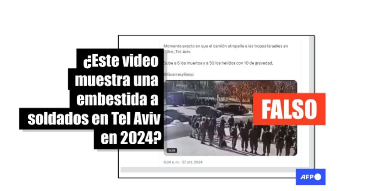 Usuarios en Facebook (1, 2) y X (1, 2) comparten la secuencia con la siguiente afirmación: “Momento exacto en que el camión atropella a las tropas israelíes en Gillot, Tel-Aviv. Sube a 6 los muertos y a 50 los heridos con 10 de gravedad”.