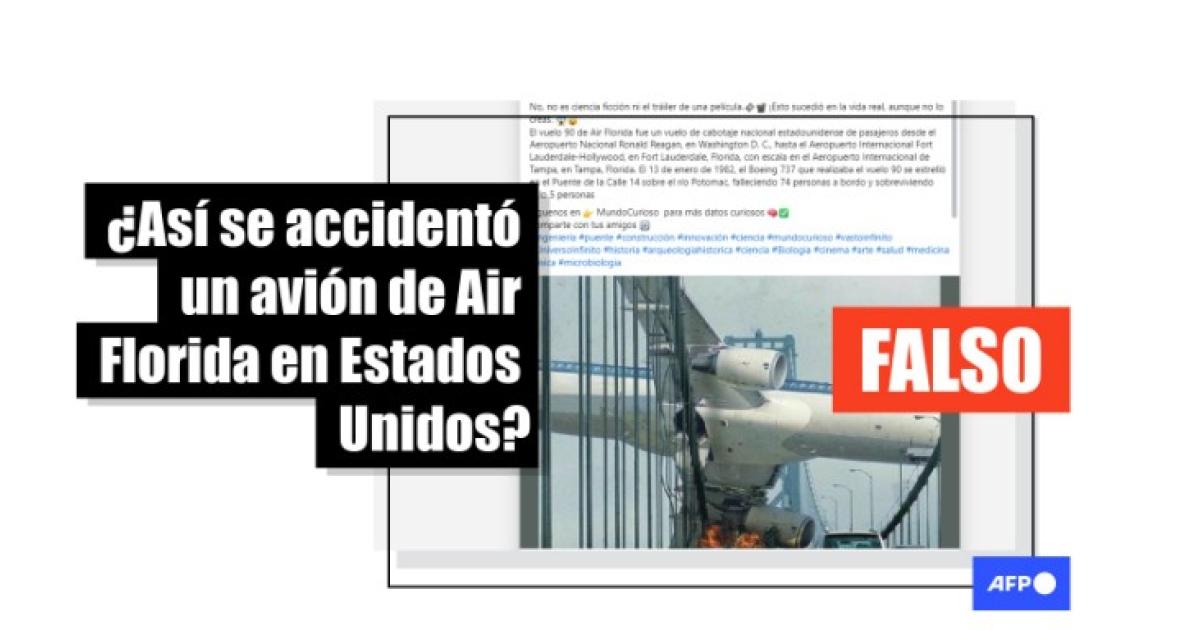 “El 13 de enero de 1982, el Boeing 737 que realizaba el vuelo 90 se estrelló en el Puente de la Calle 14 sobre el río Potomac, falleciendo 74 personas a bordo y sobreviviendo solo 5 personas” señalan usuarios en Facebook que comparten la fotografía de un avión de pasajeros incendiándose sobre el puente colgante en el que acaba, supuestamente, de impactar.