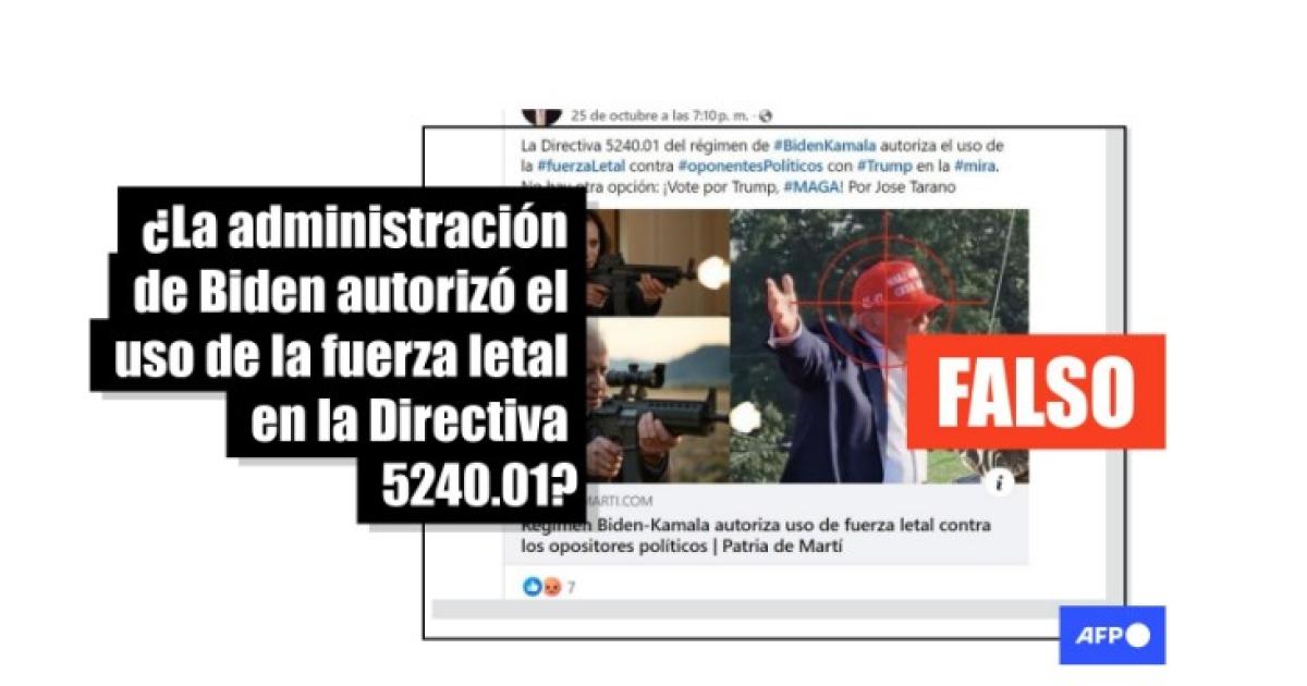 “La Directiva 5240.01 del régimen de #BidenKamala autoriza el uso de la #fuerzaLetal contra #oponentesPolíticos con #Trump en la #mira”, dicen publicaciones en Facebook y X.