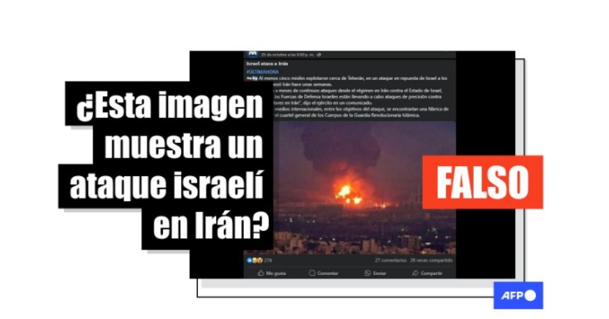 “Israel ataca a Irán ÚLTIMAHORA Al menos cinco misiles explotaron cerca de Teherán, en un ataque en repuesta de Israel a los misiles que lanzó Irán hace unas semanas”, señalan publicaciones en Facebook y X. La imagen que comparten muestra edificios iluminados por un incendio durante la noche y una columna de humo elevándose en el cielo.